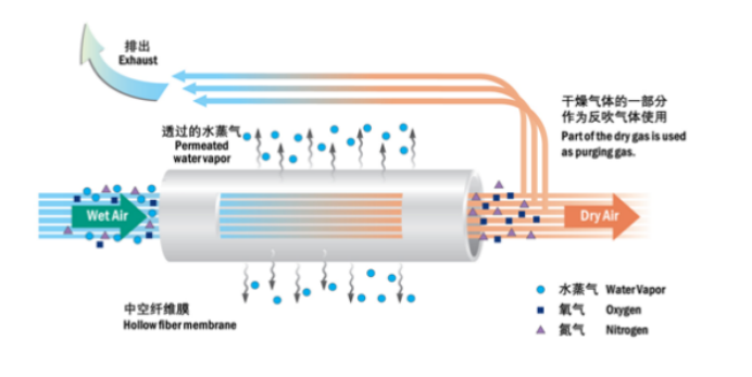 传统的脱湿方法是采用冷冻干燥机或分子筛吸附干燥机,而压缩空气膜法脱湿是近十几年来发展起来的新技术。当水蒸气通过中空纤维膜时,水分子的渗透速率较快,在压力差的作用下,水蒸气(H