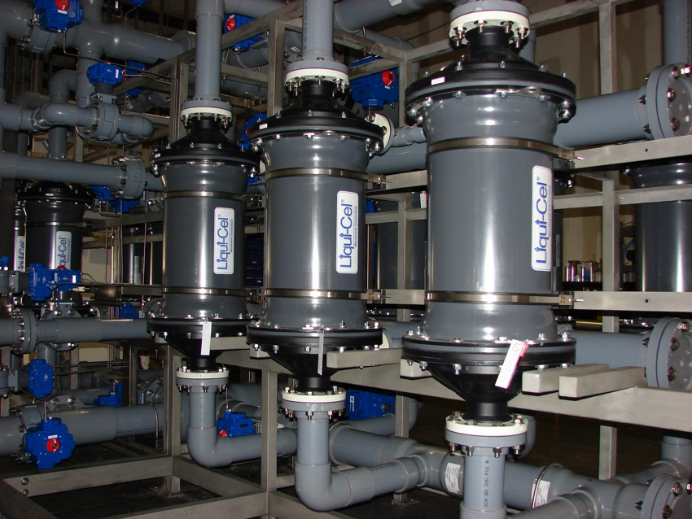 新型的纯水脱二氧化碳(CO2)技术是利用扩散的原理将水中的气体,如二氧化碳、氧气去除的膜分离产品。其工作原理是基于水在中空纤维膜丝一侧流动,同时中空纤维膜丝另一侧抽真空或者施加气体吹扫,或者两者结合。经过疏水化处理的中空纤维膜丝表面上有很多微孔,这些微孔允许气体分子穿过,却能阻挡水分子的穿透。在抽真空或者气体吹扫的负压下,中空纤维膜丝一侧水中溶解的气体,通过微孔不断向中空纤维膜丝另一侧移动,并被抽真空或者吹扫气体带走,从而达到脱除水中溶解性气体的目的。脱气膜中装有大量的中空纤维可以扩大气液界面的面积,从而提高气体脱除速度。脱气膜能够将溶氧浓度降低到1ppb水平以下,将溶解二氧化碳浓度降低到1ppm以下。