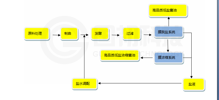 大豆经过层层挑选,洗豆蒸煮后接种制曲,加入盐水进行发酵后采用压榨沉淀过滤,酱油滤液进入脱盐系统。酱油中的氯化钠被膜脱盐系统不断脱除,直至达到脱盐目标得到低盐高品质酱油产品。国初科技膜浓缩系统可提高酱油中的有效成分的浓度,可将酱油里面的氨基态氮浓缩至更高的程度做高浓度高品质低盐酱油。该浓缩过程常温常压运行,无需在酱油中添加其他化学成分,或者在发酵工艺进行变更,是一项完全纯物理分离过滤的新型技术。