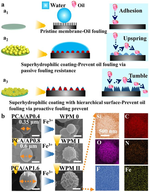 受大丽花叶超亲水性的启发,开发了具有皱纹图案的光滑亲水微粒,并将其涂覆在多孔微滤膜(MF)上,建立了非典型的超亲水性,这种超亲水性由抑制粘性原油液滴的吸附、迁移和聚集的“主动防污”(PFP)机制支撑。具体而言,基于传统的PRF机制,通过咖啡酸(CA)和不同(0.4、0.8 和 1.6 g)的(3-氨基丙基)三乙氧基硅烷(APTES)聚合形成光滑的亲水微粒,并将其命名为PCA /AP0.4、PCA/AP0.8和PCA/AP1.6。它们被涂在初级超亲水膜(PCA/APX MF)上。然后,在光滑的PCA/AP表面上描绘出皱纹图案。此类微粒表示为皱纹图案微粒(WPM X),包含此类具有不同表面皱纹程度的微粒的改性膜表示为WPM X MF。